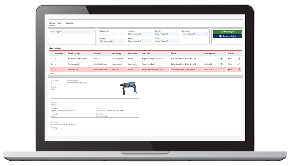 Unsere Gerätemanagement-Software bildet Ihre komplette Geräteverwaltung digital ab – inklusive Wartung, Historie, Erinnerungen und Dokumentation.
