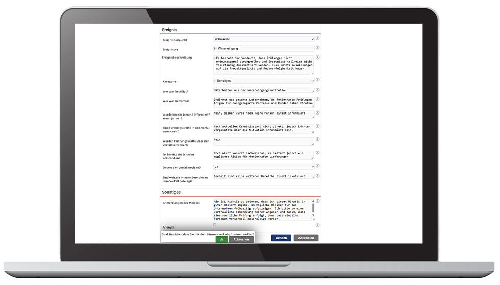 Hinweisgeber erfassen Vorfälle über ein sicheres, browserbasiertes Formular – auf Wunsch anonym. Das System nimmt automatisch eine Priorisierung vor und informiert intern zuständige Personen bei Bedarf via E-Mail.